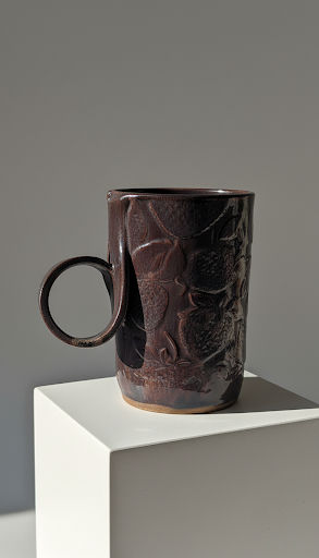 - Mug en faïence rouge émaillée, décor fraises en relief